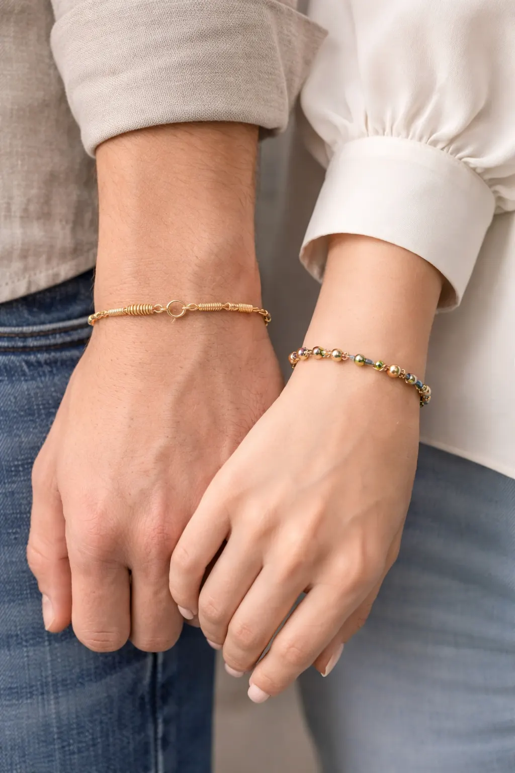 Por un lado presenta la pulsera 7 nudos entorchada. Diseñada con una estética sobria y elegante, esta pulsera entorchada está elaborada en oro laminado de 18k garantizado, lo que le confiere un brillo duradero y sofisticado. Su estructura presenta un trenzado metálico uniforme, realzado con siete detalles de nudo distribuidos simétricamente a lo largo de toda la pieza. Estos nudos evocan protección y equilibrio, lo que la convierte en una joya cargada de simbolismo. El broche tipo resorte garantiza un cierre seguro y discreto, ideal para el uso cotidiano. Su diseño rígido y ligero aporta una apariencia refinada que combina tradición artesanal con un estilo contemporáneo.