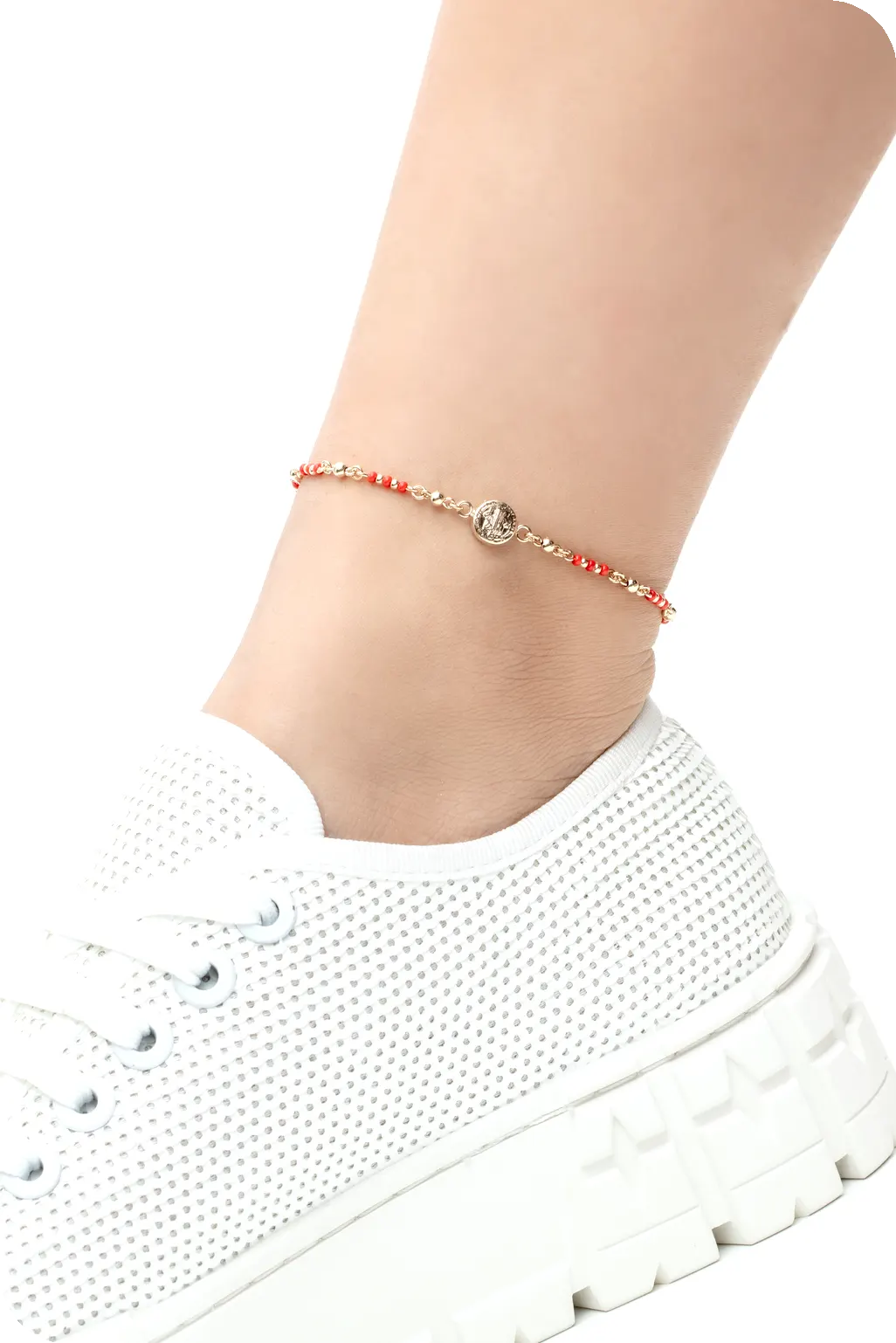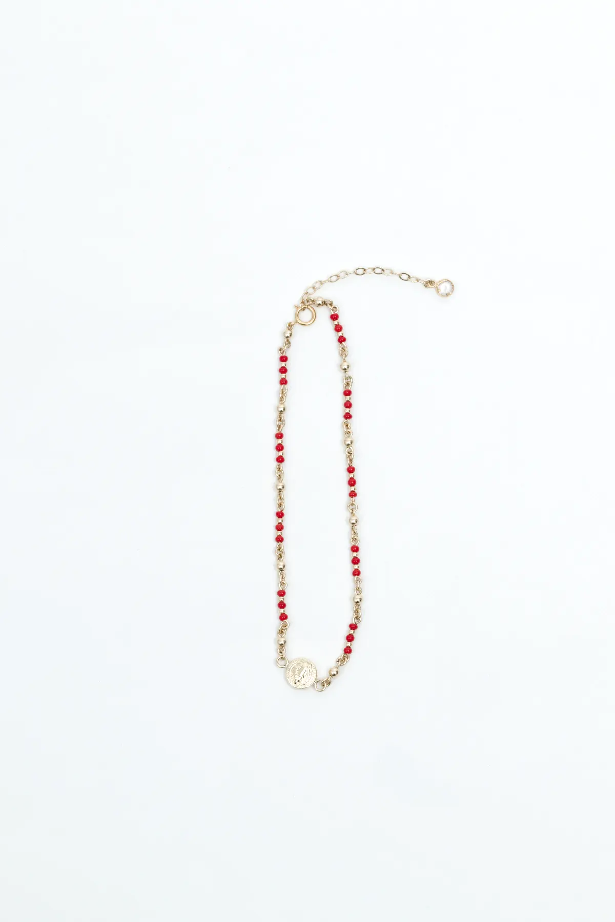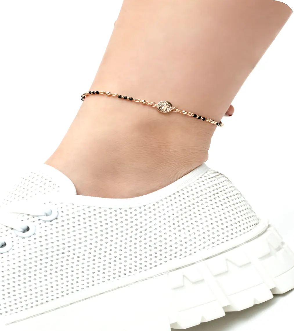 Descubre el tobillera especial en oro laminado con mostacilla y dije en oro laminado tipo san Benito sistema de agarre. Lujo, exclusividad y diseño impecable en cada pieza. Encuéntralo en TELASSIM.